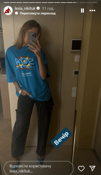 Модний образ ведуча показала на своїй сторінці в Інстаграм. На новому фото Леся Нікітюк зображена у відображенні у дзеркалі у модному аутфіті. Для теплого літнього вечора зірка обрала синю футболку оверсайз я яскравим принтом, чорні джинси вільного крою і туфлі на підборах в тон верху. Доповнила свій лук зірка прикрасами: годинником і браслетами. Такий образ водночас простий, вишуканий та стильний.