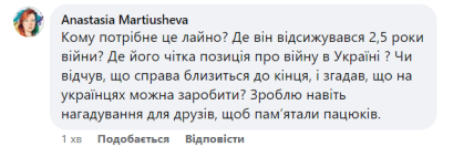 - "Кому потрібне це лайно? Де він відсижувався 2,5 роки війни? Де його чітка позиція про війну в Україні?"