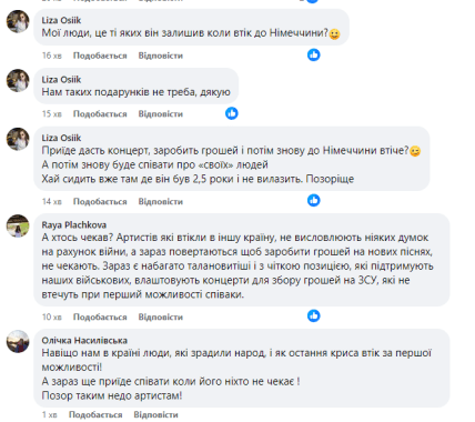 - "А хтось чекав? Артистів які втікли в іншу країну, не висловлюють ніяких думок на рахунок війни, а зараз повертаються щоб заробити грошей на нових піснях, не чекають".