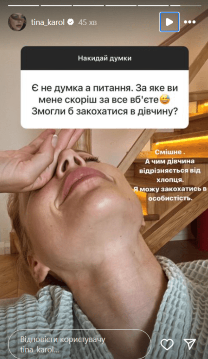 "Смішне. А чим дівчина відрізняється від хлопця. Я можу закохатись в особистість", — написала у сторіс Тіна Кароль.