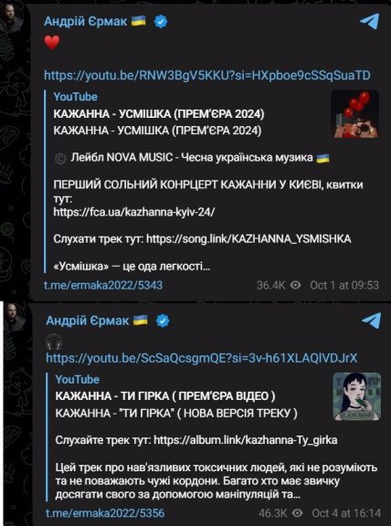 Днями у своєму Телеграм-каналі Єрмак поділився посиланнями на трендові пісні Кажанни, зокрема, на її новий хіт "Усмішка". Зазначимо, що політик тричі згадав виконавицю на своєму каналі у месенджері.