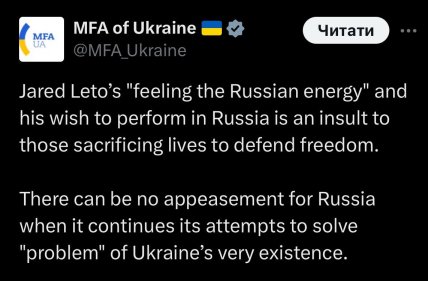 На таку заяву артиста відреагували й в Міністерстві закордонних справ України. У відомстві зазначили, що таким чином Лето образив українців, які захищають батьківщину від російських окупантів.