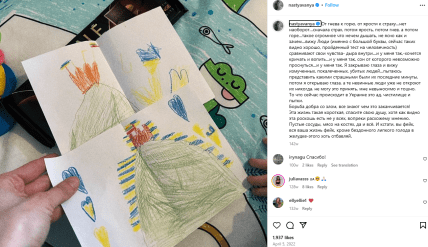 Українська акторка Катерина Тишкевич, яка підтримує зв'язок з Івановою, зазначила, що Анастасія зазнала осуду в Росії через свою проукраїнську позицію. Незважаючи на це, Іванова продовжує підтримувати Україну та виступає проти війни.