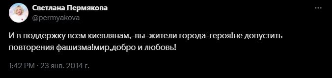 Позиція російської актриси стала зрозумілою ще 2014 року під час Євромайдану у Києві. Тоді Пермякова написала в соцмережі, що "проти фашизму": "І на підтримку всім киянам, ви жителі міста-героя! Не допустити повторення фашизму! Мир, добро та любов!".