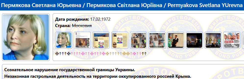 - У 2017 році її внесли до бази "Миротворець" через виступи в анексованому Криму