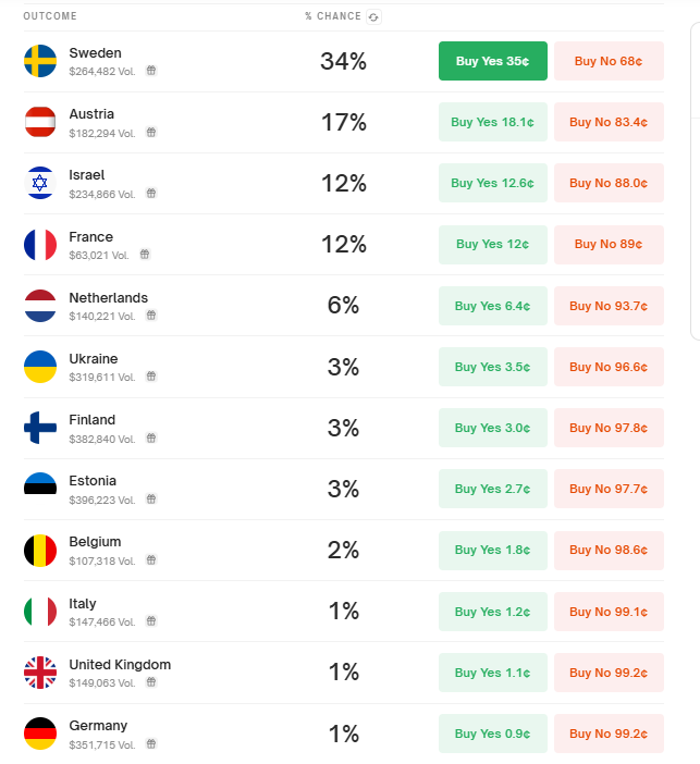 Своєю чергою Україна має коефіцієнт лише 3%. Проте, ситуація ще може змінитися. Рейтинг букмекерів оприлюднив сайт polymarket.com.