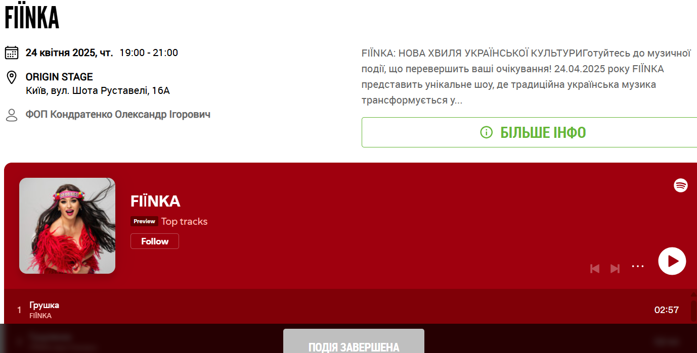 На своєму концерті 24 квітня, який відбувся на столичному майданчику Origin Stage, FIЇNKA виконувала як ліричні композиції, так і запальні — з танцями під гучні викрики глядачів. Крім цього варто додати, що на сцену виходив і Народний артист України Віктор Павлік, з яким співачка у травні має представити спільну пісню "Білі черемхи".