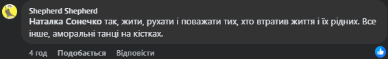 Під постом Наталки Сонечко люди пишуть загалом обурливі коментарі. Багатьох цікавить, чому не можна було хоча б перенести захід на більш вдалий час. Деяким жахливо усвідомлювати подібні інциденти, адже поки одні українці плачуть від втрат близьких людей, інші — веселяться. І це все відбувається в одному місті.