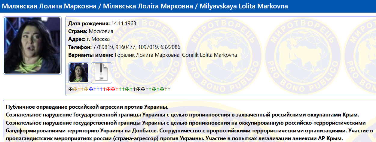 Російська співачка Лоліта Мілявська (у дівоцтві Горелик) давно живе в Росії та підтримує російських окупантів. Вона продовжує забезпечувати собі життя кривавими рублями.