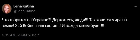 Після розпаду "Тату" співачка вирушила підкорювати Лос-Анджелес, але 2015 року ні з чим повернулася до Москви. Ще в травні 2014 року, після початку бойових дій на Донбасі, вона написала в соцмережі: "Що коїться на (в — ред.) Україні?! Тримайтеся, люди!!! Так хочеться миру на землі! Х..й Війні — наш слоган!!! І завжди таким буде!!!".