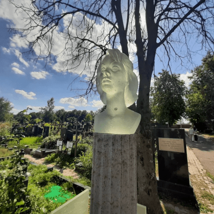 Він являє собою високу колону, нагорі якої стоїть бюст актриси, виконаний з богемського кришталю. Виглядає такий пам’ятник дуже ефектно. А внизу доповнюють композицію три таблички, на яких вказані дати життя та смерті, звання Народної артистки та намальовані квіти.