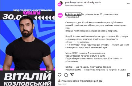 Артист також випустив україномовну версію "Піна колади", яка "порвала" усі чарти. Популярними стали й інші пісні виконавця, а днями вийшов кліп на пісню "Знаєш" на вірші Івана Франка. Зараз Козловський активно виступає, дає концерти, а нещодавно анонсував тур Україною, який розпочнеться 20 жовтня. Після гучної прем'єри з ним співпрацюють різні бренди, з якими співак робить колаборації.
