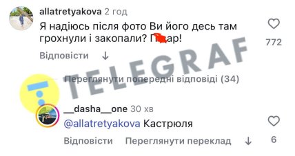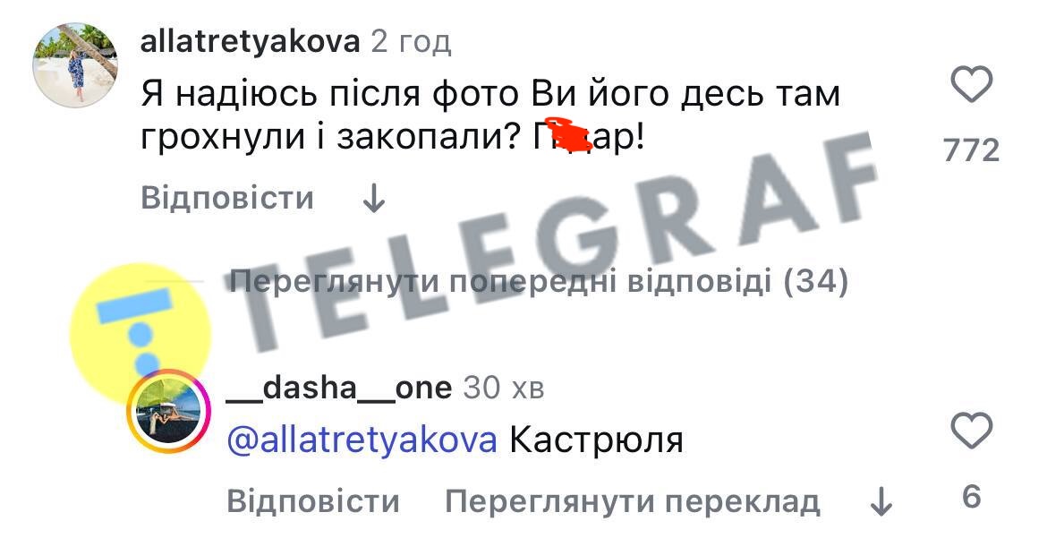 Водночас у коментарях серед купи гейту встигла виділитись блогерка та модель з Одеси Даша Ван, адже назвала коментаторку, яка висловила сподівання, що Януковича грохнули після цього фото, "каструлею". Зауважимо, що "кастрюля" і "кастрюлеголові" — висловлювання, яким росіяни та їхні посіпаки називають українських патріотів.