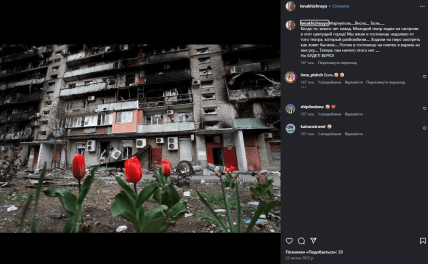 "Сьогодні День Києва!… Місто стоїть, цвітуть каштани, але я весь час думаю про тих хлопців і дівчат, які віддали своє життя заради своєї батьківщини, заради майбутнього! І без сліз не можу дивитися на величезну кількість цих прапорців на майдані Незалежності", — писала актриса 26 травня 2024 року.
