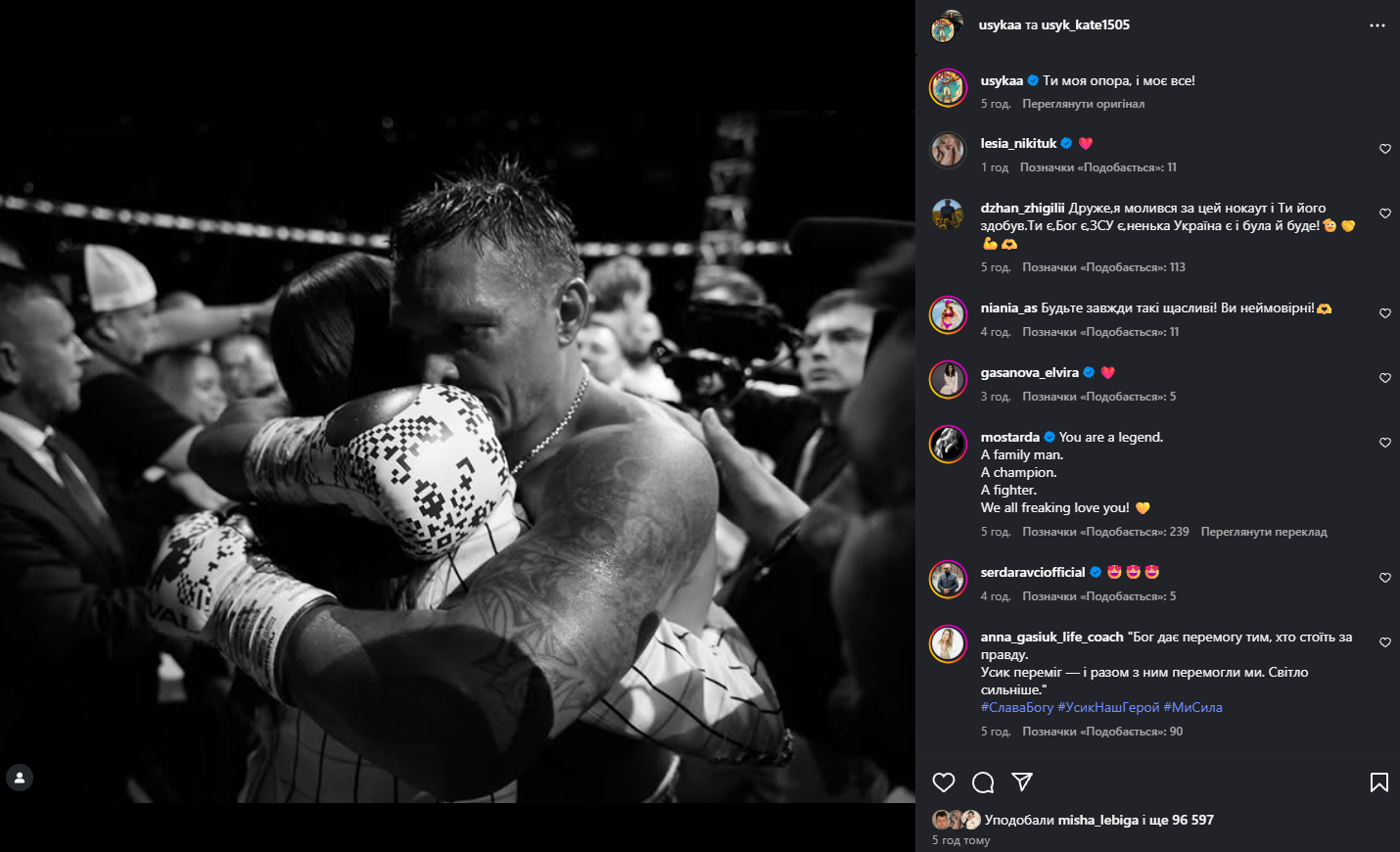 У мережі з'явились відео, на яких зафіксовано зворушливі моменти подружжя прямо на лондонському рингу. Поки Усика вітали з перемогою тренера, друзі та зірки, він шукав очима свою кохану та навіть гучно викрикував її ім'я.