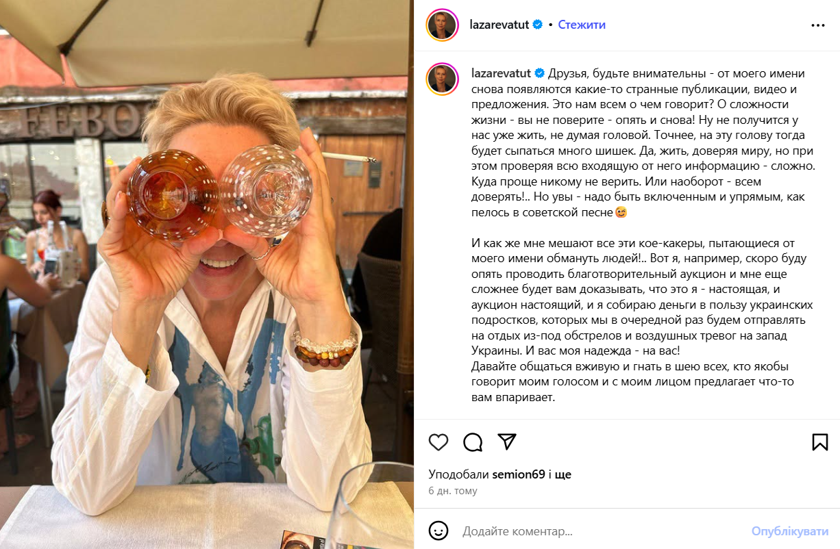 До слова, Лазарєва продовжує підтримувати українців. Днями вона оголосила, що проводитиме благодійний аукціон. "Збираю гроші на користь українських підлітків, яких ми в черговий раз відправлятимемо на відпочинок з-під обстрілів та повітряних тривог на захід України", — розповіла Тетяна в Instagram.