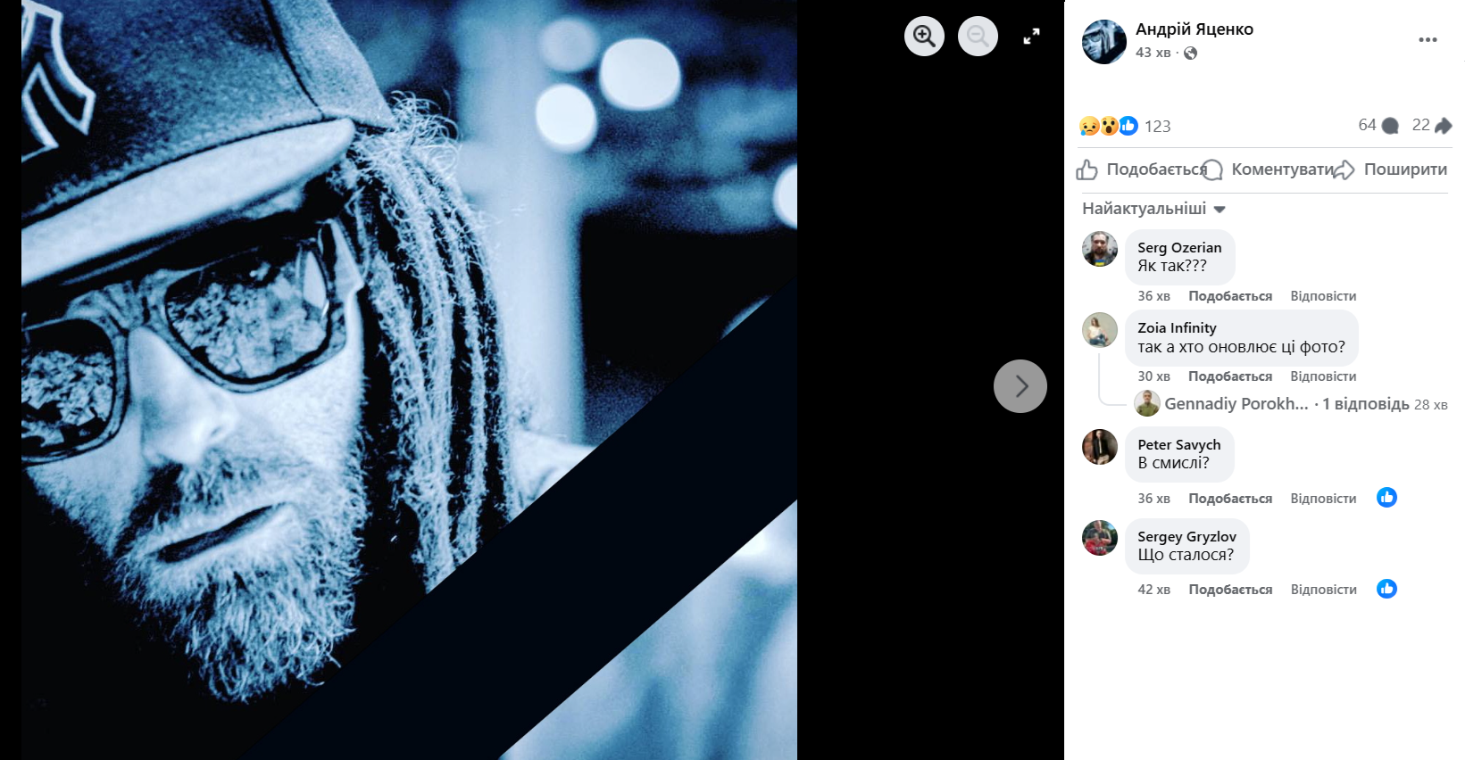 Андрій Яценко був відомим під сценічним ім’ям Diezel. Лише днями колектив презентував у соцмережах переклад українською мовою легендарного хіта "Під дощем". Тепер же на сторінці музиканта з’явилося фото із чорною стрічкою та жалобна картинка зі свічкою. Шанувальники гурту розгублені та запитують у коментарях, що трапилося.