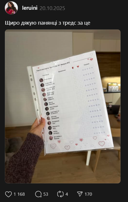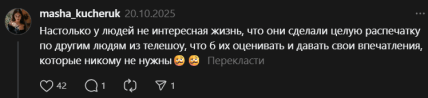 У мережі шанувальники шоу у захваті від ідеї Ольги. Багато хто дякує дівчині за оригінальний підхід, проте деякі користувачі Threads виявилися зовсім незадоволені, відзначаючи, що багатьом це нецікаво.