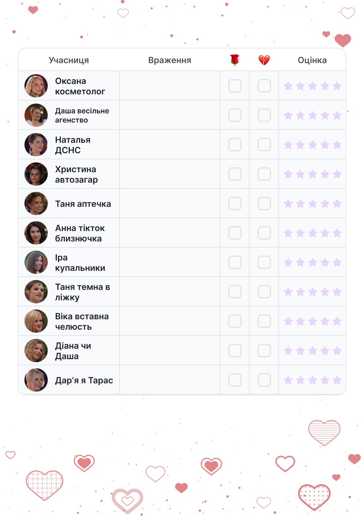 У соціальних мережах набирає популярності новий підхід до перегляду скандальних випусків розважального шоу про кохання та романтику. Українці вигадали свою оціночну таблицю, в якій вони можуть вписувати свої враження від усіх учасниць нового сезону.