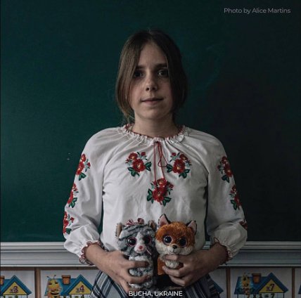 У червні 2023 року, у Всесвітній день біженців, і показала наслідки російського вторгнення в Україну. На своїй сторінці в Інстаграм Джолі опублікувала світлину дівчинки з Бучі, де окупанти творили звірства. Дитинка позувала у вишиванці, а в руках тримала іграшки.