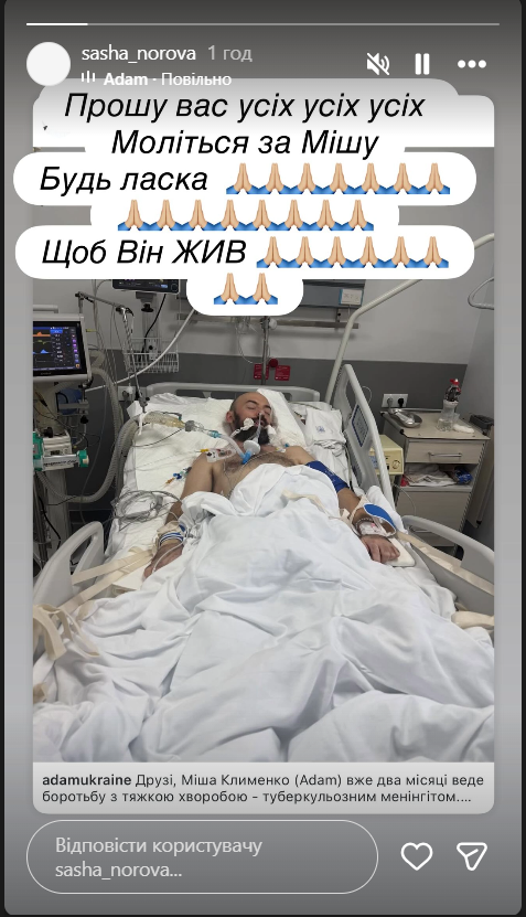 Друзі, Михайло Клименко (Adam) вже два місяці веде боротьбу з тяжкою хворобою – туберкульозним менінгітом. Після тривалого лікування та перебування у реанімації Міша перебуває у комі. Будь ласка, моліться за нього