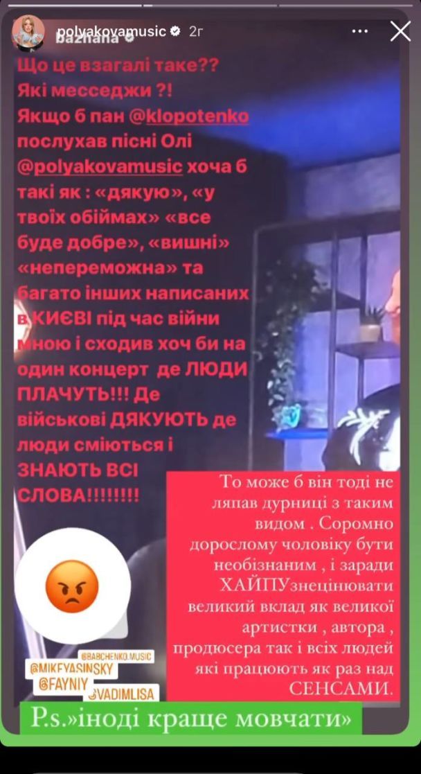 Якщо б пан Євген послухав би пісні Олі, які написані у Києві під час війни і пішов би на концерт, де люди плачуть, де військові дякують, де люди сміються і знають всі слова, то може тоді б не ляпав дурниці з таким видом. Соромно дорослому чоловіку бути необізнаним і заради хайпу знецінювати великий вклад великої артистки, яка працює над сенсами.