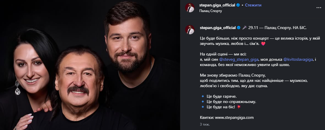 Усі заплановані концерти, включаючи виступ 29 листопада у Палаці спорту у Києві, було скасовано. Гіга мав з’явитися на столичній сцені зі своїм сином Степаном Гігою-молодшим та дочкою Квітославою.