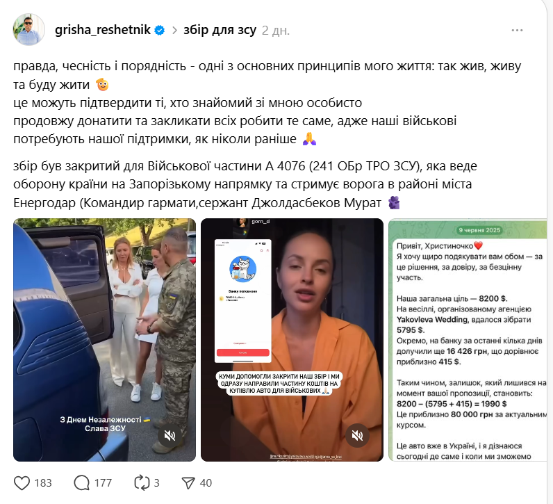 У соцмережі Threads почалося бурхливе обговорення того, що Решетнік нібито міг присвоїти гроші зі зборів на ЗСУ. Телеведучий вирішив відповісти на звинувачення та опублікував у цій же соцмережі фото та відео нібито доказів того, що кошти пішли на придбання автомобіля для військової частини А 4076.