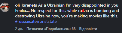 • Як українка я дуже розчарована в тобі Емілія… Жодної поваги до цього, поки Росія зараз бомбардує та знищує Україну, ви знімаєте такі фільми