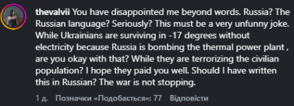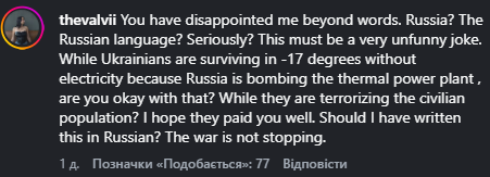• Ви розчарували мене не передати словами. Росія? Російська мова? Серйозно? Це, мабуть, дуже не смішний жарт. Поки українці виживають у -17 градусах без електроенергії, бо Росія бомбить теплоелектростанцію, тобі це добре? Поки що вони тероризують громадянське населення? Сподіваюся, вони вам добре заплатили. Треба було це писати російською? Війна не припиняється
