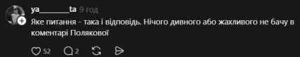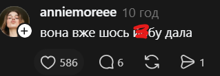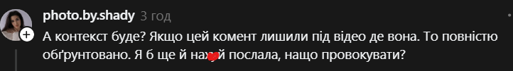 - "Якщо цей комент лишили під відео де вона. То повністю обґрунтовано. Я б ще й на*уй послала, нащо провокувати?"