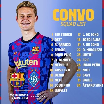Іспанська "Барселона" напередодні матчу з "Динамо", яке днями обіграло "Маріуполь" (2:3) у 13-му турі чемпіонату України, опублікувала заявку на гру 4-го туру Ліги чемпіонів УЄФА сезону 2021/22 проти "Біло-синіх".