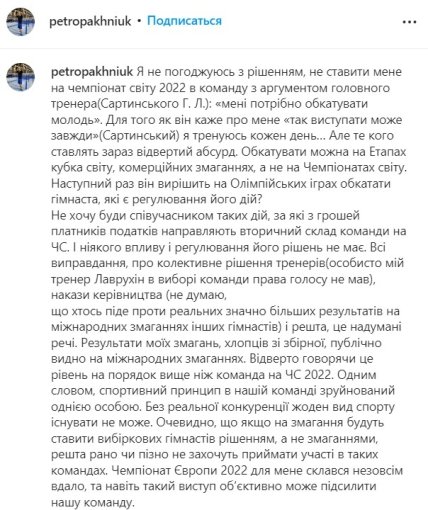 А зараз мені, як головному тренеру, треба випробувати молодих хлопців. Тому коли гімнасту вже 30 років, і у 2019 році він набирає 85 балів, а у 2022-му — 77 балів, самі розумієте, йде спад. Тут не його вина, а вина віку. Тож які можуть бути претензії? А те, що Пахнюк написав, нехай буде на його совісті", — цитує тренера suspilne.