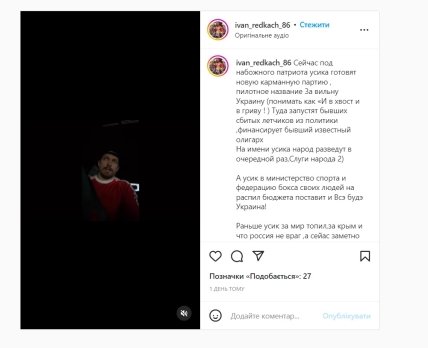 Раніше Усик за мир топив, за Крим і що росія не ворог. А зараз помітно, як він став патріотом, уже й до попів із московської РПЦ поки що не дзвонить за порадою. Усик, як у політику потрапить, буде як усі дерибанити бюджети, про бога забуде одразу! Тим людям, хто публічно про віру кричить, постійно немає віри. Хто віруючий, він добрі справи мовчки робить!" — написав Редкач у Instagram.