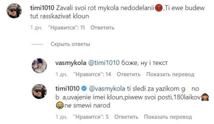 "Завали свій рот, Микола недороблений. Ти ще будеш тут розповідати, клоун. Ти стеж за мовою, г*вно, б*я. Повагу май, клоун. Пишеш свої пости, 180 лайків — не сміши народ", — відповів Мілевський.