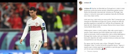 Зараз мені більше нема чого сказати. Дякую Португалії. Дякую, Катаре. Мрія була чудова, поки тривала… Тепер залишилося дочекатися, коли час стане добрим порадником і дозволить кожному зробити власні висновки", – написав Роналду.