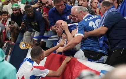 Мбаппе підбіг до вболівальника, щоб поцікавитися станом здоров’я та вибачитися. Персонал збірної Франції також приніс у подарунок фанату футболку Мбаппе.