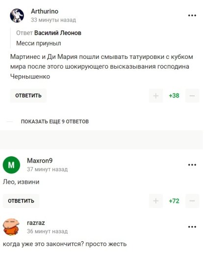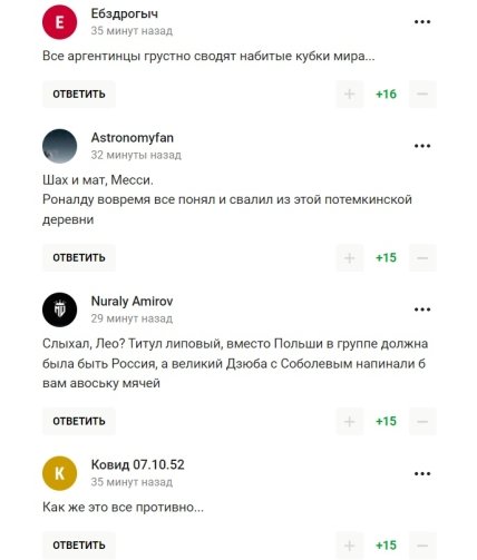 "Мессі зажурився", "Мартінес і Ді Марія пішли змивати татуювання з Кубком світу, після цього шокуючого висловлювання пана Чернишенка", "Шах і мат, Мессі. Роналду вчасно все зрозумів і звалив із цього потьомкінського села", — пишуть фанати.