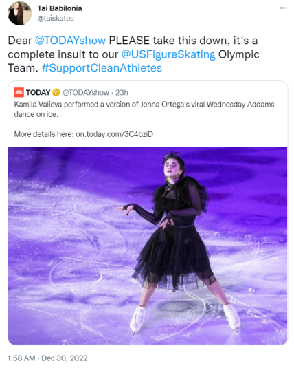 "Дороге шоу Today, будь ласка, приберіть це. Це відверта образа для нашої олімпійської збірної США з фігурного катання", — написала під публікацією чемпіонка світу 1979 року в парному катанні Тай Бабілонія.