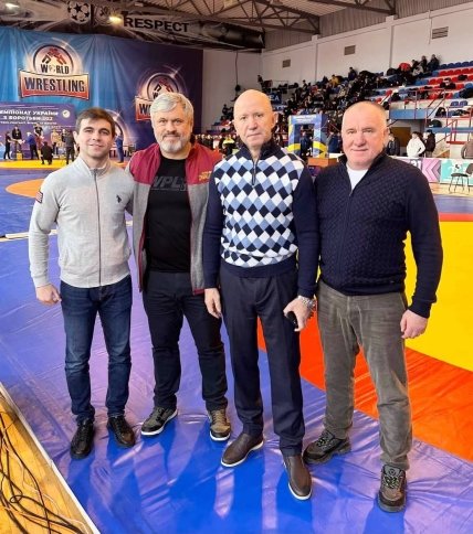 Зліва направо — Андрій Блажейко, державний тренер з вільної боротьби, Олександр Пастухов, редактор у Федерації греко-римської боротьби України, Олександр Доровський, голова наглядової ради компанії "Здоров'я", Юрій Назаренко, старший тренер жіночої збірної команди України з боротьби, на змаганнях в Ужгороді