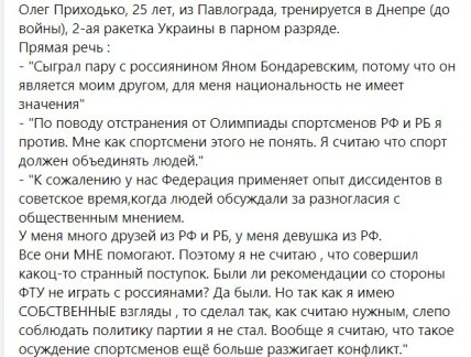 Я можу прокоментувати в пості кожний рядок цього опуса, боюся забанять. Олегу порада одна — їдьте жити й грати в рф і за рф. Сподіваюся Федерація тенісу України знайде правильне рішення щодо громадянина України Олега Приходька”, — написав Сапронов, який також додав кілька цитат тенісиста.