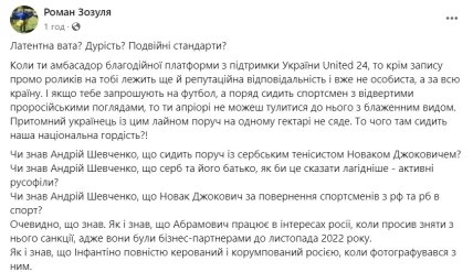 Український футболіст-волонтер Роман Зозуля наїхав на легенду українського футболу Андрія Шевченка, який сидів поряд з тенісистом Новаком Джоковичем на матчі 1/2 фіналу Ліги чемпіонів "Мілан" — "Інтер" (1:1). Серб підтримує повернення росіян у міжнародний спорт, а його батько публічно підтримав рф у війні проти України.