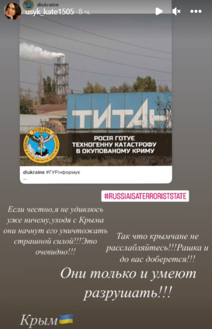 Дружина зіркового українського боксера Олександра Усика Катерина відреагувала на повідомлення ГУР МО України про те, що рф готує техногенну катастрофу в окупованому Криму після мінування хімзаводу "Кримський титан" в Армянську.