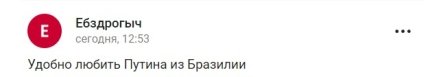 "У Бразилії абсолютно нормально ставляться до росіян. У місці, де ми живемо, у нас один президент — володимир путін. Всі бразильці говорять добре про нього і про російських людей. Нічого поганого про росію я не чув, є тільки невдоволення США.