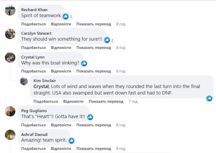 "Боротися до кінця! Дуже незвично українці долали останні із 2000 метрів у відкритому класі на чемпіонату світу з веслування на човнах "Дракон". Та вони не здалися, продовжили боротьбу і фінішували з 6 результатом із-поміж 9 команд. Браво за характер!", — йдеться у повідомленні Спортивного комітету.