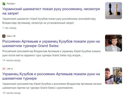 Чемпіон України з шахів (2014) Юрій Кузубов потис руку російському гросмейстеру Владиславу Артем’єву на турнірі на острові Мен (Велика Британія). Напередодні Федерація шахів України (ФШУ) рекомендувала представникам України не тиснути руки представникам країн-агресорів на змаганнях