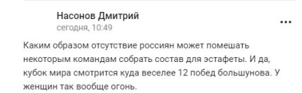 – Ну, хай продовжують гнити далі. Я також чула. До речі, я не читаю, не дивлюся, навіть не знаю, чи показують у нас, чи ні Кубки світу. Я минулого року, коли був чемпіонат світу, я досі не знаю, хто виграв, у яких дистанціях", – сказала Вяльбе.