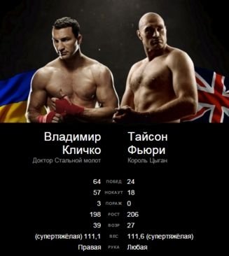 У суботу, 28 листопада, у Дюссельдорфі (Німеччина) українець Володимир Кличко (63-3, 53 КО), чемпіон світу у суперважкій вазі за версіями WBA, IBF, WBO, IBO та американського журналу The Ring, проводить бій проти британця Тайсона Ф’юрі ( 24-0, 18 ДО).