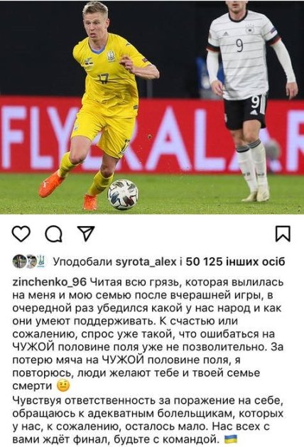 "Читаючи весь бруд, який вилився на мене і мою сім'ю після вчорашньої гри, в черговий раз переконався, який у нас народ, і як вони вміють підтримувати. На щастя чи на жаль, попит вже такий, що помилятися на чужій половині поля вже недозволено. за втрату м'яча на чужій половині поля, я повторюся, люди бажають тобі і твоїй родині смерті.