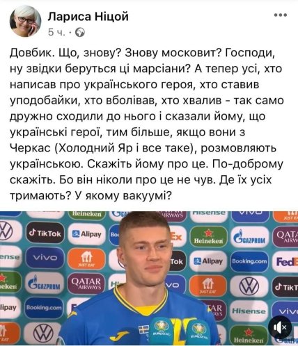Після матчу між збірними Швеції та України, в якому наша збірна здобула історичну перемогу (2: 1 в овертаймі) і пройшла в 1/4 Євро-2020, стався епічний випадок між українською письменницею і діячкою Ларисою Ніцой та Артемом Довбіком, який забив у ворота скандинавів переможний м'яч. Правда, сам Артем у ситуації участі не брав.